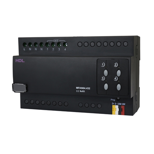 HDL-MFAN04.432 4CH Electric Fan Controller 4CH Electric Fan Controller, Each channel can output 8 fan speeds; 0 being off and 7 being maximum. Simultaneously supports four fans and can be controlled via HDL Panel. Input voltage:110/240 VAC. Parameters Model HDL-MFAN04.432 SKU 425961 Bus Power 31 mA Width 144 mm Height 90 mm Depth 66 mm Weight 340 g Material CustomOne CustomTwo CustomThree CustomFour CustomFive Discount category A 4 pcs in stock in stock in stock You can buy these goods through registered HDL partner. Question to product