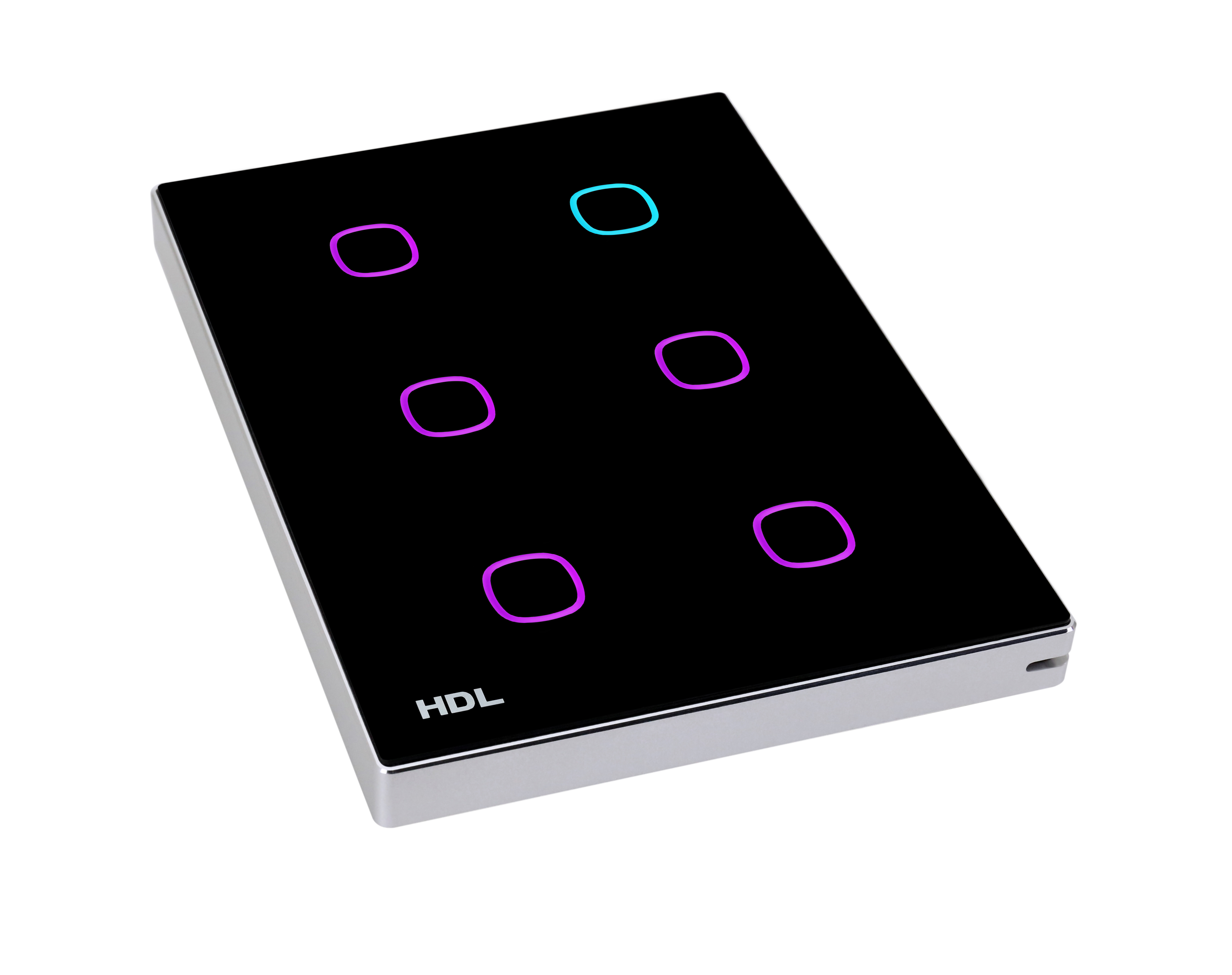 Ovládací panel série iTouch, US, 6 tlačidiel, s kovovým rámčekom, farebne nastaviteľné LED podsvietenie, spínanie a stmievanie svetiel, ovládanie závesov, riadenie scén a sekvencií, vymeniteľné čelo panelu, snímač teploty, voliteľne IR ovládač, vyžaduje zbernicovú spojku HDL-MPPI. 46-A.